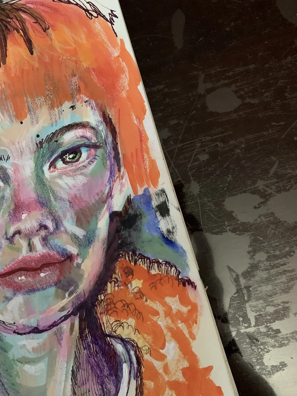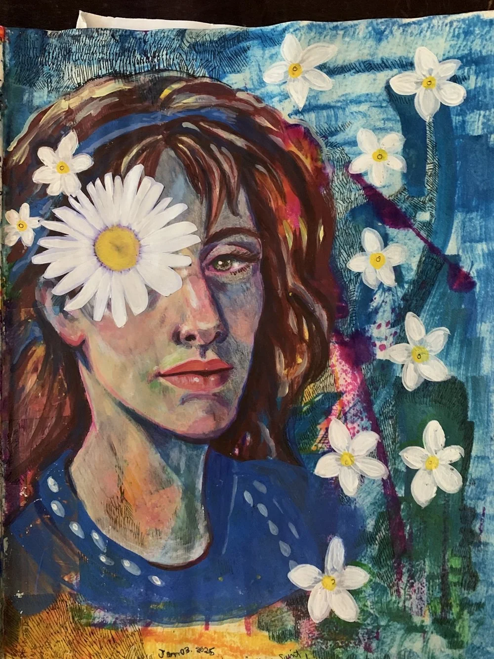 Lately, I’ve come to see my sketchbook as more than just a collection of drawings. It’s a sacred space for play, a place where ideas can tumble out unedited, where the hand moves before the mind catches up. There’s something freeing about that moment when you stop worrying about what a piece “should” look like and instead let it become what it wants to be. A robot fishing from a pier made from stacked fish? Why not? A girl with daisy eyes? An orange haired lady sketched with ink, and tape, and glue and crayons? Of course! Is there something she is trying to tell me? Will I ever know? Some sketches bloom into ideas for future paintings, and others are nothing more than joyful experiments. Each one reminds me why I fell in love with creating in the first place.