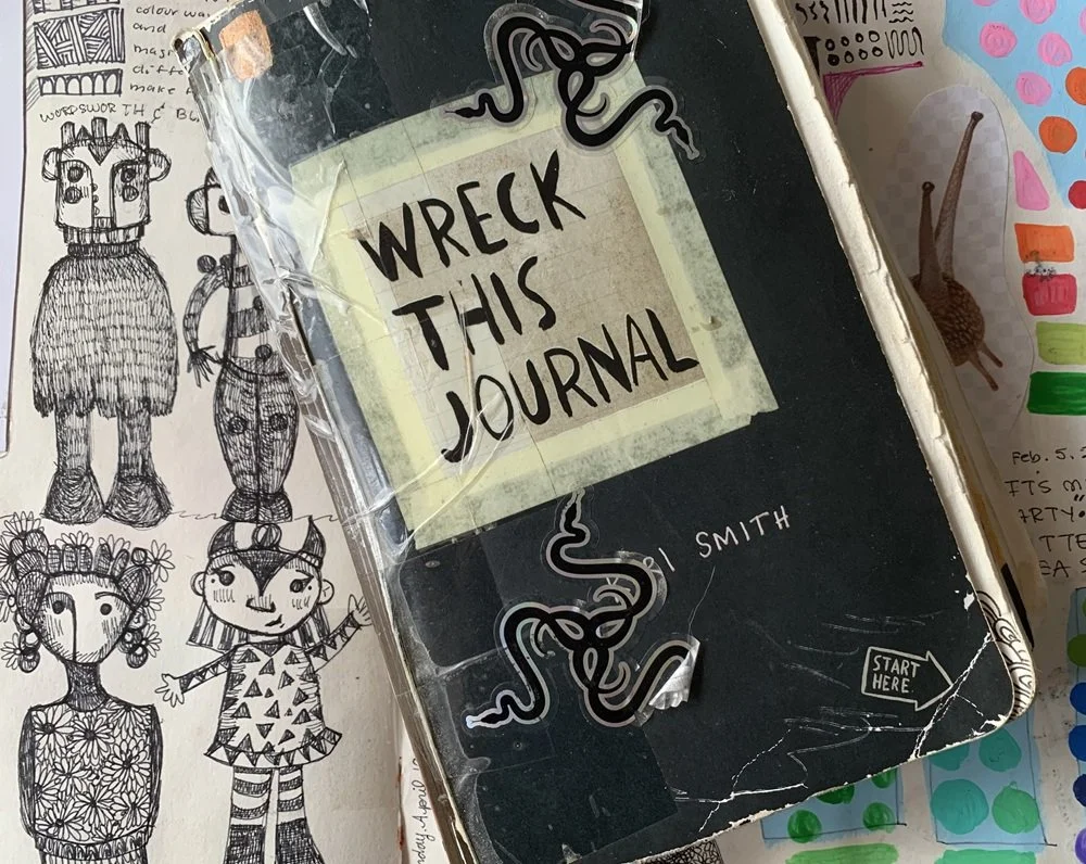 One year, lovely Mary gifted me with a journal to purposely (shock!) destroy!! You may have seen this book with the cheeky, inviting title, “Wreck This Journal”. It sat pristine on my shelf for days. WRECK A JOURNAL? I didn’t think my heart could take it. The instructions say things like, “ Bring this book in the shower with you”, “Tie a string to the spine of this book. Swing wildly, let it hit the walls,” “Rub here with dirt”, “Sample various substances found in your home. Document what they are. Create colour themes”, the list goes on. I was brave and finally caved in; it was so much fun! Having permission to be spontaneous and reckless gave me such delight that I’ve been transferring some of that curiosity and playfulness into my actual sketchbooks.